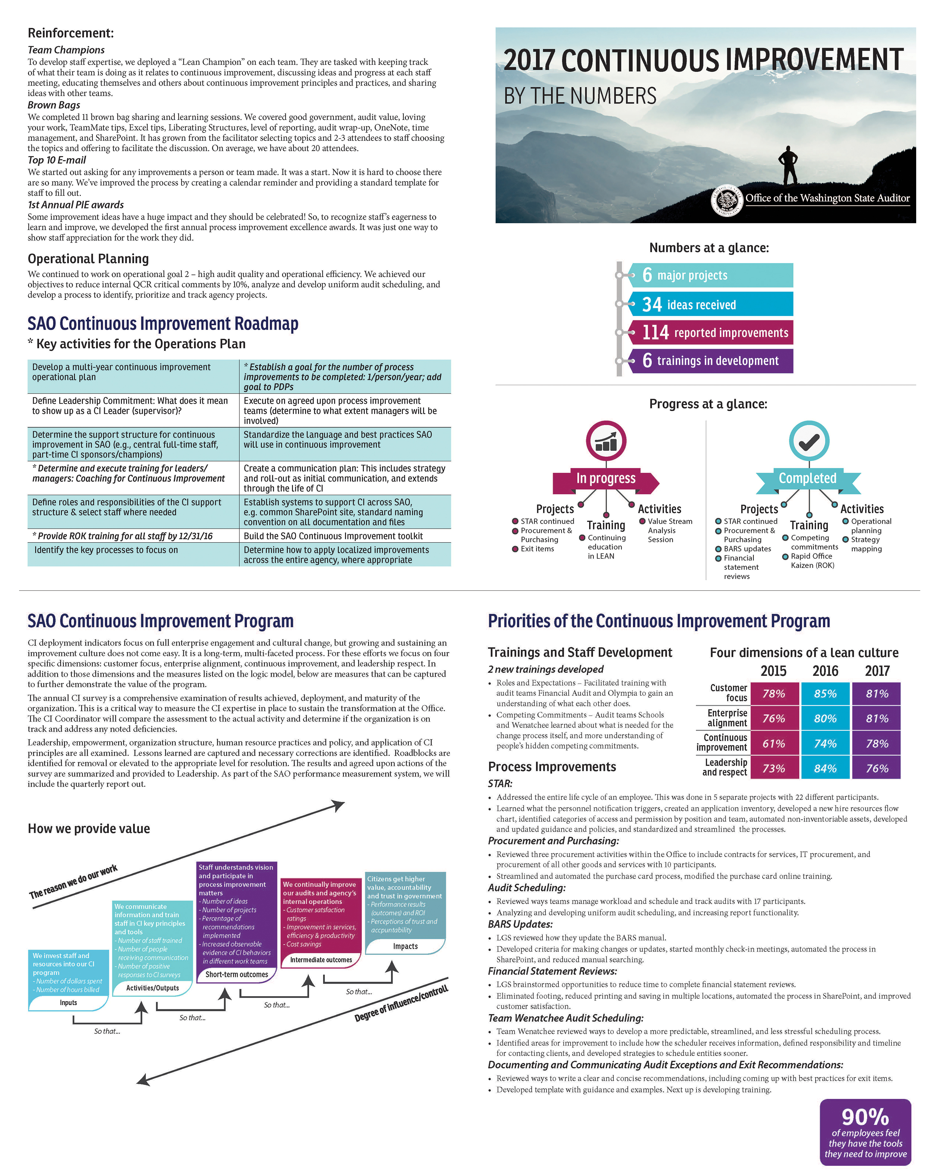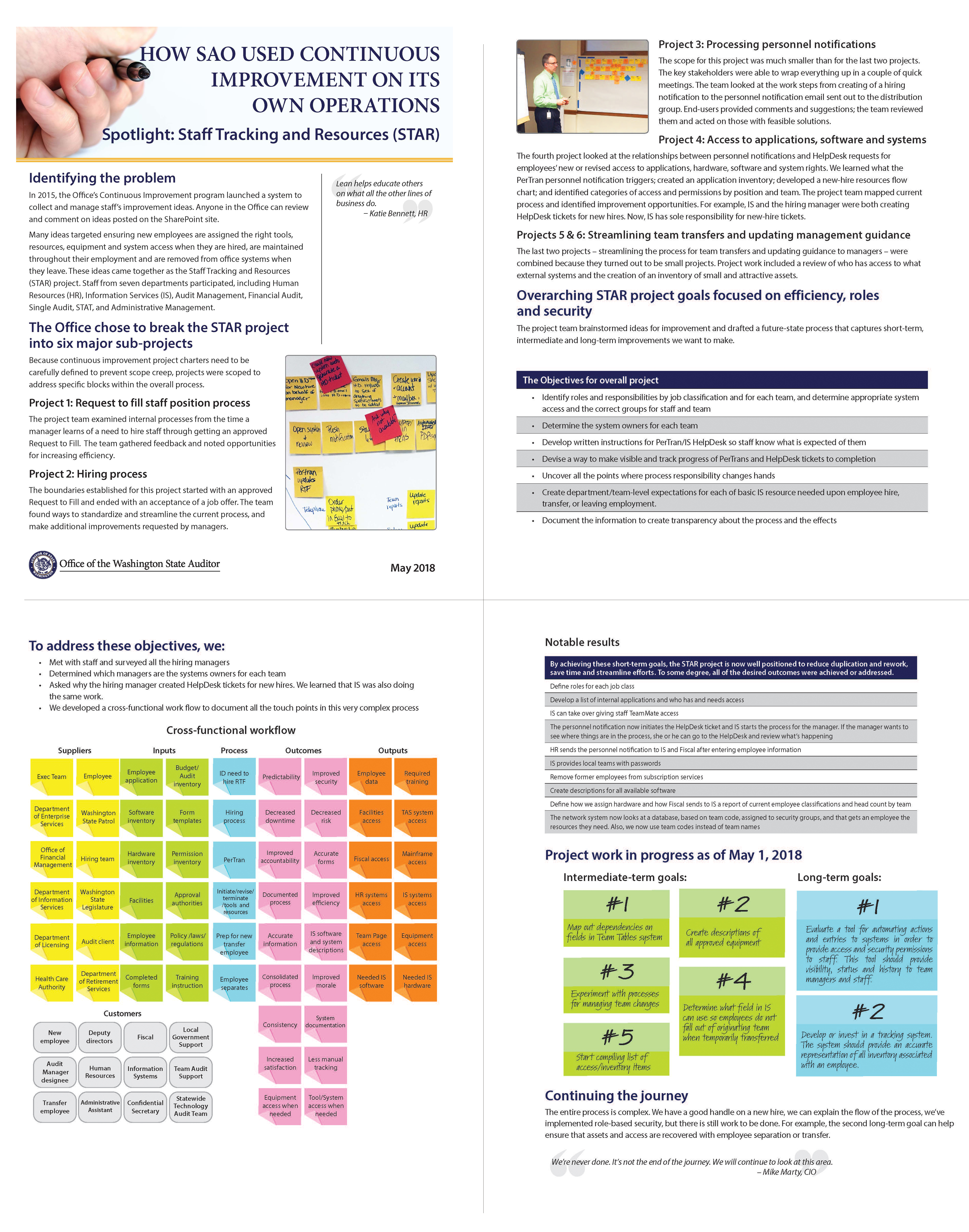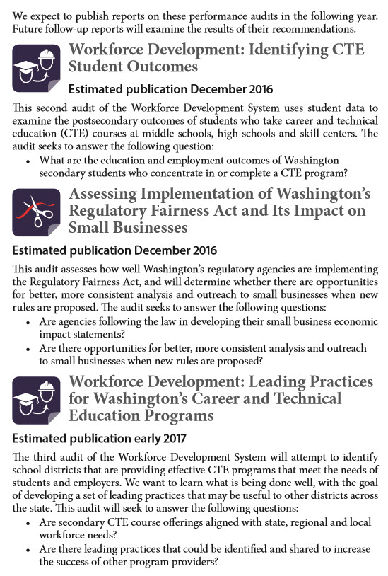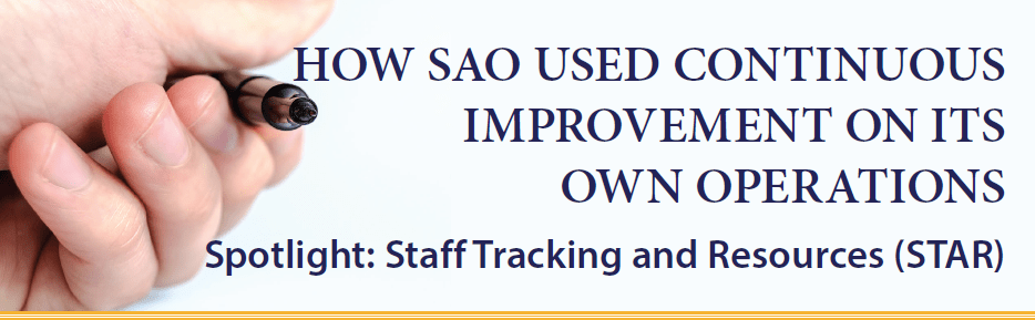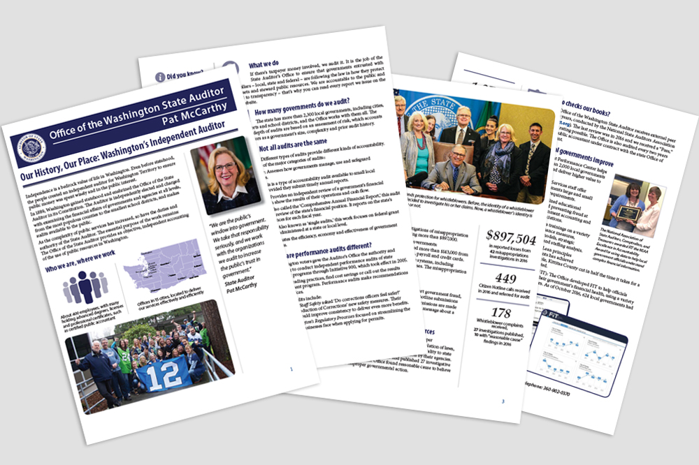A sample of outreach materials for the public and Legislature, showcasing SAO’s achievements, case studies, process improvements, and information about what type of work the Office of the State Auditor does.